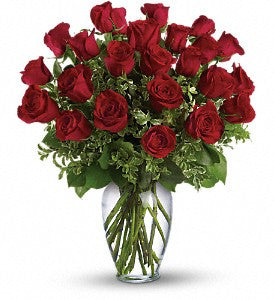 Shown: Two Dozen Long Stem Roses in a Vase