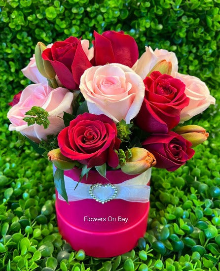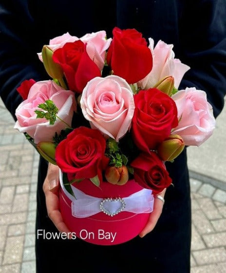 Red and pink roses with tulips arranged in a fancy box.
